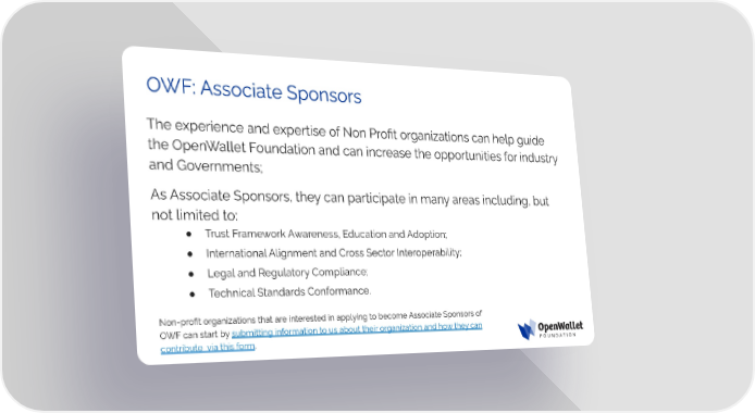 OWF: Associate Sponsors The experience and expertise of Non Profit organizations can help guide the OpenWallet Foundation and can increase the opportunities for industry and Governments; As Associate Sponsors, they can participate in many areas including, but not limited to: ● Trust Framework Awareness, Education and Adoption; ● International Alignment and Cross Sector Interoperability; ● Legal and Regulatory Compliance; ● Technical Standards Conformance. Non-profit organizations that are interested in applying to become Associate Sponsors of OWF can start by submitting information to us about their organization and how they can contribute via this form.