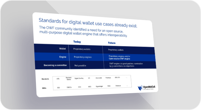 Standards for digital wallet use cases already exist. The OWF community identified a need for an open source, multi-purpose digital wallet engine that offers interoperability. Today Future Wallet Proprietary wallets Proprietary wallets Proprietary engine, and/or Proprietary engines Engine Open source OWF engine OWF engine: 10 good patches, nomination Becoming a committer Not possible by 3 committers, no objections
