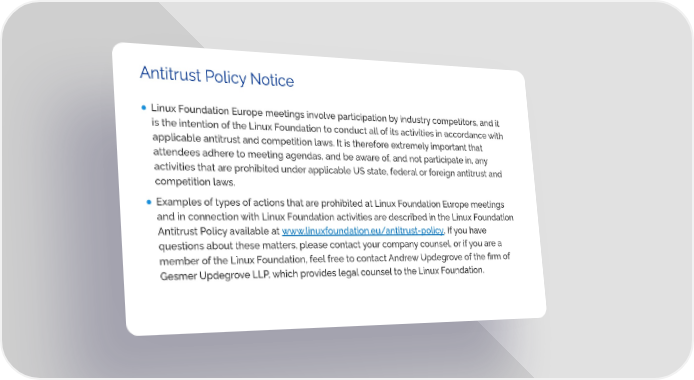 Antitrust Policy Notice ● Linux Foundation Europe meetings involve participation by industry competitors, and it is the intention of the Linux Foundation to conduct all of its activities in accordance with applicable antitrust and competition laws. It is therefore extremely important that attendees adhere to meeting agendas, and be aware of, and not participate in, any activities that are prohibited under applicable US state, federal or foreign antitrust and competition laws. ● Examples of types of actions that are prohibited at Linux Foundation Europe meetings and in connection with Linux Foundation activities are described in the Linux Foundation Antitrust Policy available at www.linuxfoundation.eu/antitrust-policy. If you have questions about these matters, please contact your company counsel, or if you are a member of the Linux Foundation, feel free to contact Andrew Updegrove of the firm of Gesmer Updegrove LLP, which provides legal counsel to the Linux Foundation.
