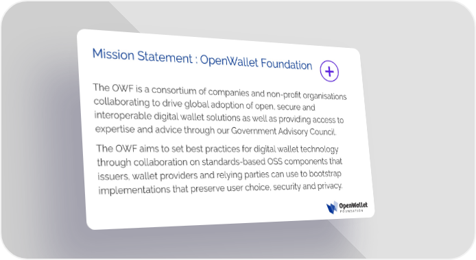 Mission Statement : OpenWallet Foundation The OWF is a consortium of companies and non-profit organisations collaborating to drive global adoption of open, secure and interoperable digital wallet solutions as well as providing access to expertise and advice through our Government Advisory Council. The OWF aims to set best practices for digital wallet technology through collaboration on standards-based OSS components that issuers, wallet providers and relying parties can use to bootstrap implementations that preserve user choice, security and privacy.