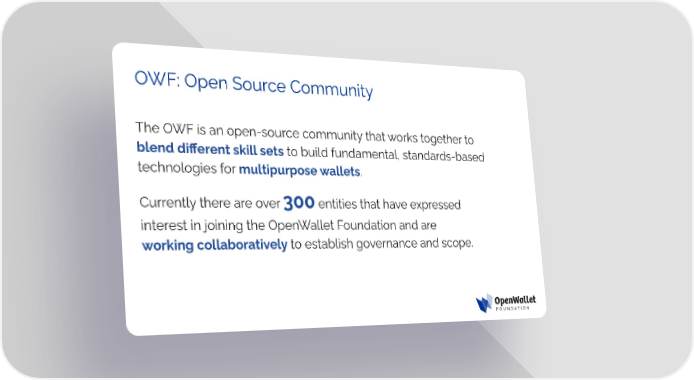 OWF: Open Source Community The OWF is an open-source community that works together to blend diļ¬erent skill sets to build fundamental, standards-based technologies for multipurpose wallets. Currently there are over 300 entities that have expressed interest in joining the OpenWallet Foundation and are working collaboratively to establish governance and scope.