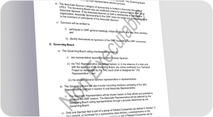 any Committee. c) General Sponsors, acting as a class, will be entitled to annually elect one representative to the Governing Board for every ten General Sponsors, up to a maximum of three total representatives, provided that there will always be at least one General Sponsor representative, even if there are less than ten General Sponsors. The Governing Board determines the General Sponsor representative election process. d) The Associate Sponsor category of sponsorship is limited to Associate Sponsors of LFEU. The Governing Board may set additional criteria for sponsoring the OWF as an Associate Sponsor. If the Associate Sponsor is itself a membership or participation organization, Associate Sponsorship in the OWF does not confer any privileges or rights to the members or participants of the Associate Sponsor. e) Sponsors will be entitled to: i) participate in OWF general meetings, initiatives, events and any other activities; and ii) identify themselves as sponsors of the OWF supporting the OWF community. 3) Governing Board a) The Governing Board voting members will consist of: i) one representative appointed by each Premier Sponsor; ii) the TAC Representative (as defined below), or, in the absence of a chair and with the approval of the Governing Board, any active contributor to a Technical Project so designated by the TAC (such chair or designee the “TAC Representative”); and iii) the elected General Sponsor representative or representatives. b) The Governing Board will also include nonvoting members consisting of the GAC Representative (defined in Section 4) and Associate Representative. i) The Associate Representative will be chosen based on their efforts and potential to advance the OWF mission. The Associate Representative will be selected by the Governing Board voting representatives through a process determined by the Governing Board. c) Only one Sponsor that is part of a group of Related Companies (as defined in Section 7) may appoint, or nominate for a sponsorship class election, a representative on the Governing Board. No single Sponsor, company or set of Related Companies will be entitled to: (i) appoint or nominate for sponsorship class election more than one representative for the Governing Board, or (ii) have more than two representatives on the Governing Board. 6