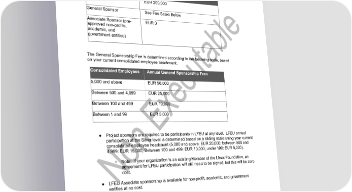 Exhibit C – OpenWallet Foundation Sponsorship Levels The sponsorship levels and associated fees are listed below. Sponsorship Class Annual Sponsorship Fees Premier Sponsor EUR 200,000 General Sponsor See Fee Scale Below Associate Sponsor (pre- EUR 0 approved non-profits, academic, and government entities) The General Sponsorship Fee is determined according to the following scale, based on your current consolidated employee headcount: Consolidated Employees Annual General Sponsorship Fees 5,000 and above EUR 50,000 Between 500 and 4,999 EUR 25,000 Between 100 and 499 EUR 10,000 Between 1 and 99 EUR 5,000 ● Project sponsors are required to be participants in LFEU at any level. LFEU annual participation at the Silver level is determined based on a sliding scale using your current consolidated employee headcount (5,000 and above: EUR 20,000; between 500 and 4,999: EUR 15,000; Between 100 and 499: EUR 10,000; under 100: EUR 5,000). ○ Note: if your organization is an existing Member of the Linux Foundation, an agreement for LFEU participation will still need to be signed, but this will be zero cost. ● LFEU Associate sponsorship is available for non-profit, academic, and government entities at no cost. 13