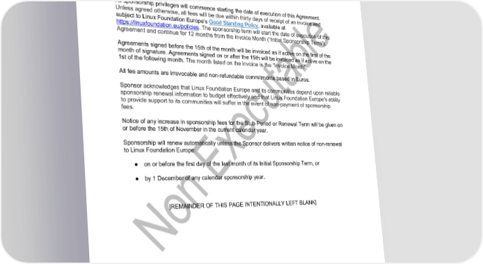 For General Sponsors, at the first anniversary of sponsorship, if sponsorship is not canceled at least thirty days prior to the first anniversary of sponsorship, a prorated amount of fees for the remainder of that calendar year will be assessed (and sponsorship will proceed on a calendar- year based renewal cycle thereafter). Sponsorship Fees and Initial Sponsorship Term: All sponsorship privileges will commence starting the date of execution of this Agreement. Unless agreed otherwise, all fees will be due within thirty days of receipt of an invoice and subject to Linux Foundation Europe’s Good Standing Policy, available at https://linuxfoundation.eu/policies. The sponsorship term will start the date of execution of this Agreement and continue for 12 months from the Invoice Month (“Initial Sponsorship Term”). Agreements signed before the 15th of the month will be invoiced as if active on the first of the month of signature. Agreements signed on or after the 15th will be invoiced as if active on the 1st of the following month. The month listed on the invoice is the “Invoice Month”. All fee amounts are irrevocable and non-refundable commitments based in Euros. Sponsor acknowledges that Linux Foundation Europe and its communities depend upon reliable sponsorship renewal information to budget effectively and that Linux Foundation Europe's ability to provide support to its communities will suffer in the event of non-payment of sponsorship fees. Notice of any increase in sponsorship fees for the Stub Period or Renewal Term will be given on or before the 15th of November in the current calendar year. Sponsorship will renew automatically unless the Sponsor delivers written notice of non-renewal to Linux Foundation Europe: ● on or before the first day of the last month of its Initial Sponsorship Term, or ● by 1 December of any calendar sponsorship year. [REMAINDER OF THIS PAGE INTENTIONALLY LEFT BLANK] 2