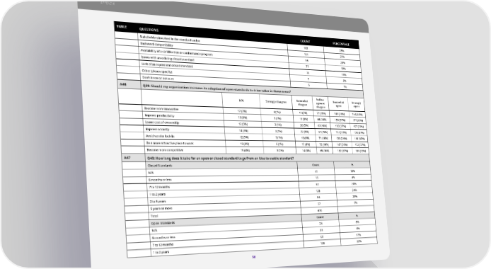 APPENDIX TABLE QUESTIONS COUNT PERCENTAGE Stakeholders involved in the standardization 102 25% Backward compatibility 101 25% Availability of a certification or conformance program 95 23% Issues with an existing closed standard 77 19% Lack of an equivalent closed standard 76 19% Other (please specify) 7 2% Don’t know or not sure 6 1% A46 Q39: Should my organization increase its adoption of open standards to drive value in these areas? Neither Somewhat Somewhat Strongly N/A Strongly disagree agree or disagree agree agree disagree Become more innovative 12 (3%) 4 (1%) 11 (3%) 77 (19%) 140 (34%) 164 (40%) Improve productivity 13 (3%) 3 (1%) 11 (3%) 56 (14%) 150 (37%) 177 (43%) Lower cost of ownership 12 (3%) 3 (1%) 20 (5%) 63 (16%) 150 (37%) 157 (39%) Improve security 14 (3%) 3 (1%) 22 (5%) 61 (15%) 133 (33%) 174 (43%) Avoid vendor lock-in 12 (3%) 3 (1%) 18 (4%) 71 (18%) 138 (34%) 161 (40%) Be a more attractive place to work 16 (4%) 6 (1%) 15 (4%) 72 (18%) 147 (36%) 152 (37%) Become more competitive 15 (4%) 3 (1%) 14 (3%) 65 (16%) 152 (37%) 160 (39%) A47 Q40: How long does it take for an open or closed standard to go from an idea to usable standard? Closed Standards Count % N/A 41 10% 6 months or less 15 4% 7 to 12 months 81 20% 1 to 2 years 138 34% 2 to 5 years 94 23% 5 years or more 37 9% Total 406 Open Standards Count % N/A 24 6% 6 months or less 23 6% 7 to 12 months 68 17% 1 to 2 years 130 32% 50