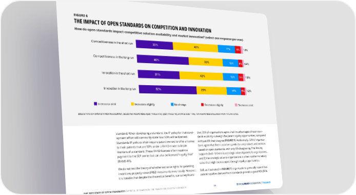 FIGURE 6 THE IMPACT OF OPEN STANDARDS ON COMPETITION AND INNOVATION How do open standards impact competitive solution availability and market innovation? (select one response per row) Comp�titiv�n��� in th� �hort run 33% 43% 17% 6% 1.6% Comp�titiv�n��� in th� long run 46% 33% 15% 4% 1.4% Innovation in th� �hort run 37% 42% 15% 5% 1.8% 52% 29% 14% 4% 1.2% Innovation in th� long run Incr�a��� a lot Incr�a��� �lightly No chang� D�cr�a��� �lightly D�cr�a��� a lot 2023 STATE OF OPEN STANDARDS SURVEY, SELECTED RESPONSES Q22 (TABLE A18), Q23 (TABLE 19), SAMPLE SIZE = 442, N/A RESPONSES EXCLUDED FROM THE ANALYSIS. standard. When developing a standard, the IP policy for that devel- that 73% of organizations agree that the advantages of open stan- opment effort will commonly state how SEPs will be licensed. dards explicitly outweigh the patent royalty opportunities, compared Standards IP policies often require patent owners to offer a license FIGURE 7). Additionally, 72% of organiza- with just 8% that disagree ( to their patents that are SEPs under a RAND model to imple- tions agree that their customers prefer to use products and services menters of a standard. These RAND licenses often require a based on open standards, with only 8% disagreeing. This finding payment to the SEP owner but can also be licensed “royalty-free” supports both 1) there is a strategic value of patents to organizations, (RAND-RF). and 2) the strategic value to organizations is often not the monetary value that might be recouped through royalty opportunities. We do not test the theory of whether exclusive rights for patenting FIGURE 7, organizations generally report that inventions properly reward R&D investments in our study. However, Still, as illustrated in it is notable that despite the theoretical benefits, our survey found patent royalties derived from standards provide a good ROI (58% THE 2023 STATE OF OPEN STANDARDS EMPIRICAL RESEARCH ON THE TRANSITION TO OPEN STANDARDS 19