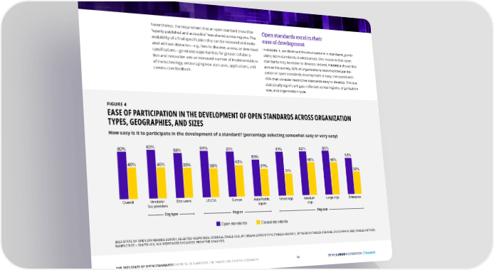 Nevertheless, the requirement that an open standard should be Open standards excel in their “openly published and accessible” was shared across regions. The ease of development availability of a final specification that can be reviewed and evalu- ated without obstacles—e.g., fees to discover, access, or download In FIGURE 1, we observed that involvement in standards, partic- specifications—generates opportunities for greater collabora- ularly open standards, is widespread. One reason is that open FIGURE 4 shows that tion and innovation and an increased number of implementations standards may be easier to develop. Indeed, of the technology, encouraging new use cases, applications, and across the survey, 60% of organizations reported that partici- constructive feedback. pation in open standards development is easy, compared with 40% that consider restrictive standards easy to develop. This is a statistically significant gap, reflected across regions, organization size, and organization type. FIGURE 4 EASE OF PARTICIPATION IN THE DEVELOPMENT OF OPEN STANDARDS ACROSS ORGANIZATION TYPES, GEOGRAPHIES, AND SIZES How easy is it to participate in the development of a standard? (percentage selecting somewhat easy or very easy) 60% 63% 58% 64% 61% 61% 62% 63% 50% 53% 43% 46% 46% 40% 40% 39% 38% 37% 31% 32% Ov�rall V�ndor�/ End u��r� US/CA Europ� A�ia-Paci�ic Small org� ��dium Larg� org� Ent�rpri�� Svc provid�r� Japan org� Org typ� R�gion Org �iz� Op�n �tandard� Clo��d �tandard� 2023 STATE OF OPEN STANDARDS SURVEY, SELECTED RESPONSES, OVERALL (TABLE A52), BY ORGANIZATION TYPE (TABLES A53/A54), BY REGION (TABLES A55/A56), BY COMPANY SIZE (TABLES A57/A58), SAMPLE SIZE = 364 TO 406, N/A RESPONSES EXCLUDED FROM THE ANALYSIS. THE 2023 STATE OF OPEN STANDARDS EMPIRICAL RESEARCH ON THE TRANSITION TO OPEN STANDARDS 14