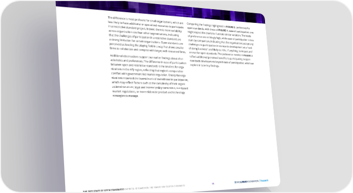 The difference is most profound for small organizations, which are FIGURE 2, preference for Comparing the findings highlighted in FIGURE 4, ease of participation, one less likely to have additional or specialized resources to participate open standards, with those of in a restrictive standard project. Indeed, there is more variability might expect the charts to illustrate similar variation. The levels across organization size than other segmentations, indicating of preference are strikingly high, while ease of participation is less that the challenges of participation in a restrictive standard are stark by comparison, indicating that the organizations accept any a strong limitation for certain organizations. Open standards are challenges to participation in standards development as a “cost perceived as leveling the playing field in a way that allows smaller of doing business” and likely do little, if anything, to impact pref- FIGURE 2 firms to collaborate and compete with larger, well-resourced firms. erence for open standards. The preference metrics in reflect additional perceived benefits to participating in open Additional observations support our earlier findings about char- standards development beyond ease of participation, which we acteristics and preferences. The difference in ease of participation explore in later key findings. between open and restrictive standards is the smallest for orga- nizations in the APJ region, reflecting that region’s comparative comfort with government-led market regulation. Enterprise orga- nizations reported the lowest levels of overall ease in participation, which may reflect factors such as the complexity of their organi- zational structure, legal and internal policy constraints, size-based market regulations, or more elaborate product and technology strategies to manage. THE 2023 STATE OF OPEN STANDARDS EMPIRICAL RESEARCH ON THE TRANSITION TO OPEN STANDARDS 15