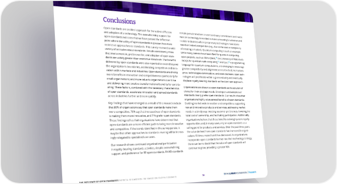 Conclusions Open standards are an ideal approach for the widest diffusion remain prevalent where an extraordinary commitment and invest- and adoption of a technology. The overwhelming support for ment in technology is needed to make a meaningful advance and open standards indicates that we have passed the inflection in older industries where proprietary technologies have domi- point where the utility of open standards is greater than more nated or limited competition (e.g., due to the cost or complexity restrictive approaches to standards. This survey reviewed a wide of entering a market). Quantum computing is such an example. variety of attitudes about standards. Results consistently show While many patents have been filed for quantum computing, that involvement in, preference for, and adoption of open stan- 18 the University of Waterloo’s open projects, such as IBM’s Qiskit, 19 20 dards are widely greater than restrictive standards. The benefits libOQS for quantum-safe computing, and Quil, a programming delivered by open standards were also reported to extend beyond language for quantum computations, are emerging to encourage the organization’s boundaries, accelerating competition and inno- greater compatibility and alignment across the field. As markets vation within markets and industries. Open standards are driving grow, technologies commoditize, and costs decrease, open tech- more benefits in innovation and competitiveness (particularly for nologies will proliferate within a given industry and eventually small organizations) and more value to organizations over time displace royalty-bearing standards as the dominant approach. and delivering more positive transformational benefits for contrib- uting. These factors, combined with the necessary characteristics Organizations are drawn to open standards as the solution of of open standards, accelerate innovation and spread standards choice for their strategic needs. Developers and adopters of across industries further and more quickly. standards clearly prefer open standards. Our results show that organizations highly value several benefits of open standards: Key findings that have emerged as a result of this research include Enabling market-wide innovation and competition, supporting that 80% of organizations say that open standards make them new and innovative products and services, addressing market more competitive, 76% say that increased use of open standards needs in a timely way, meeting customer preferences, lowering the is making them more innovative, and 71% prefer open standards. total cost of ownership, and facilitating participation. Additionally, These findings tell us that organizations have determined that organizations believe that these benefits outweigh patent royalty open standards are a more efficient path to being more innovative opportunities and, in many cases, rely on open standards as a and competitive. If the trends identified in this survey persist, it selling point for products and services. Over the past three years, may be that other approaches to standards-making will be increas- the value derived from open standards has increased in organi- ingly relegated to specialized use cases. zations 13 times more than it has decreased. As organizations incorporate open standards further into their technology strategy, Our research shows continued organizational participation there can be no doubt that the value of open standards will in royalty-bearing standards activities, despite overwhelming continue to grow, providing a greater ROI. support and preference for RF open standards. RAND standards THE 2023 STATE OF OPEN STANDARDS EMPIRICAL RESEARCH ON THE TRANSITION TO OPEN STANDARDS 30