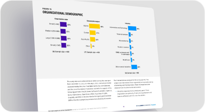 FIGURE 15 ORGANIZATIONAL DEMOGRAPHIC Organization �iz� G�ographic r�gion Indu�try Small (1–249) 29% US/CA 48% 48% In�ormation and T�chnology 23% 27% 8% ��dium (250–999) Europ� Financial ��rvic�� 26% 22% 6% Larg� (1,000–9,999) A�ia-Paci�ic �anu�acturing Small (1–249) 22% 3% 6% Oth�r Bu�in��� ��rvic�� R�tail, �hol��al� and Q8, Sampl� �iz� = 490 Q7, Sampl� �iz� = 496 5% E-comm�rc� 5% H�althcar� Oth�r nam�d indu�tri�� 28% Q6, Sampl� �iz� = 496 The study data were collected via an online survey that was open The final sample size analyzed for the survey was 496. This from December 21, 2022, to February 6, 2023, and was promoted sample size only includes those respondents who passed a variety via social media, the Linux Foundation and Linux.com websites, of screening and filtering criteria. These 496 responses were and the Linux Foundation Newsletter and with the support of the obtained from the aforementioned sources: following partners: the JDF, Green Software Foundation, OpenUK, • 295 (60%) responses from a third-party panel. These Ecma International, OpenChain, SPDX, Trust Over IP, C2PA, respondents are primarily IT end-user organizations and GraphQL, and RISC-V. We also hired a third-party panel provider have no affiliation with the Linux Foundation. (60% of the final sample) to promote more diversity of answers. THE 2023 STATE OF OPEN STANDARDS EMPIRICAL RESEARCH ON THE TRANSITION TO OPEN STANDARDS 32