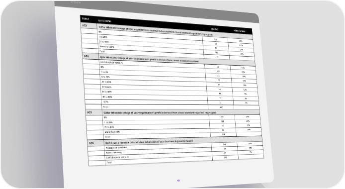 APPENDIX TABLE QUESTIONS COUNT PERCENTAGE A23 Q25a: What percentage of your organization’s revenue is derived from closed standard royalties? (regrouped) 0% 100 26% 1 to 20% 83 22% 21 to 40% 81 21% More than 40% 115 30% Total 379 A24 Q26: What percentage of your organization’s profit is derived from closed standard royalties? Don’t know or not sure 68 15% 0% 100 23% 1 to 5% 45 10% 6 to 20% 69 16% 21 to 40% 65 15% 41 to 60% 52 12% 61 to 80% 30 7% 81 to 99% 11 2% 100% 2 0% Total 442 A25 Q26a: What percentage of your organization’s profit is derived from closed standard royalties? (regrouped) 0% 100 27% 1 to 20% 114 30% 21 to 40% 65 17% More than 40% 95 25% Total 374 A26 Q27: From a revenue point of view, which side of your business is growing faster? Products or solutions 266 78% Patent licensing 49 14% Don’t know or not sure 25 7% Total 340 43