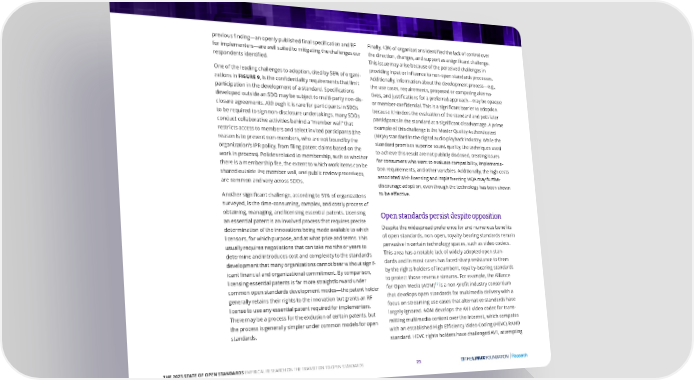 previous finding—an openly published final specification and RF Finally, 43% of organizations identified the lack of control over for implementers—are well suited to mitigating the challenges our the direction, changes, and support as a significant challenge. respondents identified. This issue may arise because of the perceived challenges in One of the leading challenges to adoption, cited by 58% of organi- providing input or influence to non-open standards processes. FIGURE 9, is the confidentiality requirements that limit Additionally, information about the development process—e.g., zations in the use cases, requirements, proposed or competing alterna- participation in the development of a standard. Specifications tives, and justifications for a preferred approach—may be opaque developed outside an SDO may be subject to multi-party non-dis- or member-confidential. This is a significant barrier to adoption closure agreements. Although it is rare for participants in SDOs because it hinders the evaluation of the standard and puts later to be required to sign non-disclosure undertakings, many SDOs participants in the standard at a significant disadvantage. A prime conduct collaborative activities behind a “member wall” that example of this challenge is the Master Quality Authenticated restricts access to members and select invited participants (the (MQA) standard in the digital audio playback industry. While the reason is to prevent non-members, who are not bound by the standard promises superior sound quality, the techniques used organization’s IPR policy, from filing patent claims based on the to achieve this result are not publicly disclosed, creating issues work in process). Policies related to membership, such as whether for consumers who want to evaluate compatibility, implementa- there is a membership fee, the extent to which work items can be tion requirements, and other variables. Additionally, the high costs shared outside the member wall, and public review procedures, associated with licensing and implementing MQA may further are common and vary across SDOs. discourage adoption, even though the technology has been shown Another significant challenge, according to 51% of organizations to be effective. surveyed, is the time-consuming, complex, and costly process of obtaining, managing, and licensing essential patents. Licensing Open standards persist despite opposition an essential patent is an involved process that requires precise determination of the innovations being made available to which Despite the widespread preference for and numerous benefits licensors, for which purpose, and at what price and terms. This of open standards, non-open, royalty-bearing standards remain usually requires negotiations that can take months or years to pervasive in certain technology spaces, such as video codecs. determine and introduces cost and complexity to the standard’s This area has a notable lack of widely adopted open stan- development that many organizations cannot bear without signif- dards and in most cases has faced sharp resistance to them icant financial and organizational commitment. By comparison, by the rights holders of incumbent, royalty-bearing standards licensing essential patents is far more straightforward under to protect those revenue streams. For example, the Alliance common open standards development modes—the patent holder for Open Media (AOM)17 is a non-profit industry consortium generally retains their rights to the innovation but grants an RF that develops open standards for multimedia delivery with a license to use any essential patent required for implementers. focus on streaming use cases that alternative standards have There may be a process for the exclusion of certain patents, but largely ignored. AOM develops the AV1 video codec for trans- the process is generally simpler under common models for open mitting multimedia content over the Internet, which competes standards. with an established High Efficiency Video Coding (HEVC) RAND standard. HEVC rights holders have challenged AV1, attempting THE 2023 STATE OF OPEN STANDARDS EMPIRICAL RESEARCH ON THE TRANSITION TO OPEN STANDARDS 23