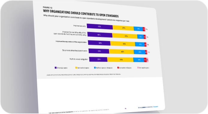 FIGURE 13 WHY ORGANIZATIONS SHOULD CONTRIBUTE TO OPEN STANDARDS Why should your organization contribute to open standards development? (select one response per row) 42% 37% 16% 4% 1% Improv� ��curity Improv� th� ov�rall quality o� th� 40% 44% 12% 3% 1% op�n �tandard� that th�y ar� curr�ntly u�ing Improv� th� r�putation o� th� organization 36% 43% 17% 3% 1% 33% 42% 20% 4% 1% B� a mor� a琀琀ractiv� plac� to �ork 29% 45% 19% 5%2% Ful�ill it� moral obligation Strongly agr�� Som��hat agr�� N�ith�r agr�� or di�agr�� Som��hat di�agr�� Strongly di�agr�� 2023 STATE OF OPEN STANDARDS SURVEY, Q45 (TABLE A59), SAMPLE SIZE=496, N/A RESPONSES EXCLUDED FROM THE ANALYSIS. THE 2023 STATE OF OPEN STANDARDS EMPIRICAL RESEARCH ON THE TRANSITION TO OPEN STANDARDS 28