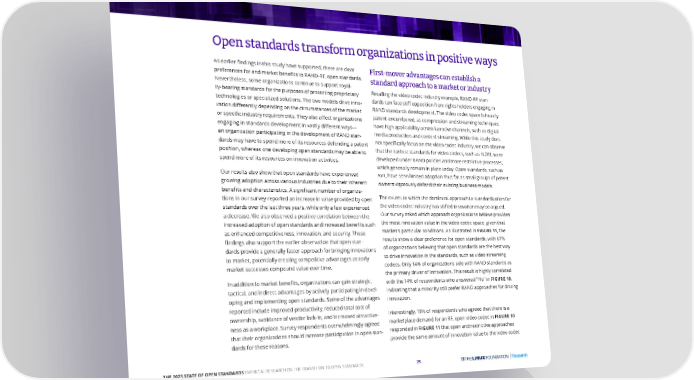 Open standards transform organizations in positive ways As earlier findings in this study have supported, there are clear First-mover advantages can establish a preferences for and market benefits to RAND-RF, open standards. standard approach to a market or industry Nevertheless, some organizations continue to support royal- ty-bearing standards for the purposes of protecting proprietary Recalling the video codec industry example, RAND-RF stan- technologies or specialized solutions. The two models drive inno- dards can face stiff opposition from rights holders engaging in vation differently depending on the circumstances of the market RAND standards development. The video codec space is heavily or specific industry requirements. They also affect organizations patent-encumbered, as compression and streaming techniques engaging in standards development in vastly different ways— have high applicability across lucrative channels, such as digital an organization participating in the development of RAND stan- media production and content streaming. While this study does dards may have to spend more of its resources defending a patent not specifically focus on the video codec industry, we can observe position, whereas one developing open standards may be able to that the earliest standards for video codecs, such as H.261, were spend more of its resources on innovation activities. developed under RAND policies and more restrictive processes, which generally remain in place today. Open standards, such as Our results also show that open standards have experienced AV1, have seen limited adoption thus far as small groups of patent growing adoption across various industries due to their inherent owners vigorously defend their existing business models. benefits and characteristics. A significant number of organiza- tions in our survey reported an increase in value provided by open The extent to which the dominant approach to standardization for standards over the last three years, while only a few experienced the video codec industry has stifled innovation may be argued. a decrease. We also observed a positive correlation between the Our survey asked which approach organizations believe provides increased adoption of open standards and increased benefits such the most innovation value in the video codec space, given that FIGURE 11, the as enhanced competitiveness, innovation, and security. These market’s particular conditions. As illustrated in findings also support the earlier observation that open stan- results show a clear preference for open standards, with 67% dards provide a generally faster approach for bringing innovations of organizations believing that open standards are the best way to market, potentially creating competitive advantages as early to drive innovation in the standards, such as video streaming market successes compound value over time. codecs. Only 14% of organizations side with RAND standards as the primary driver of innovation. This result is highly correlated In addition to market benefits, organizations can gain strategic, FIGURE 10, with the 14% of respondents who answered "No" in tactical, and indirect advantages by actively participating in devel- indicating that a minority still prefer RAND approaches for driving oping and implementing open standards. Some of the advantages innovation. reported include improved productivity, reduced total cost of ownership, avoidance of vendor lock-in, and increased attractive- Interestingly, 19% of respondents who agreed that there is a FIGURE 10 ness as a workplace. Survey respondents overwhelmingly agreed marketplace demand for an RF, open video codec in FIGURE 11 that open and restrictive approaches that their organizations should increase participation in open stan- responded in dards for these reasons. provide the same amount of innovation value to the video codec THE 2023 STATE OF OPEN STANDARDS EMPIRICAL RESEARCH ON THE TRANSITION TO OPEN STANDARDS 25