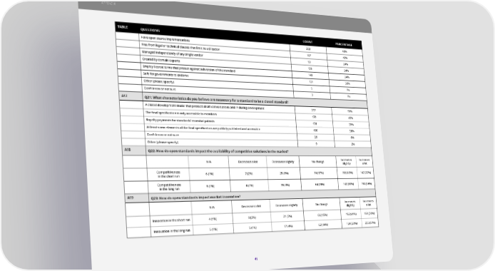 APPENDIX TABLE QUESTIONS COUNT PERCENTAGE Have open source implementations 203 46% Free from legal or technical clauses that limit its utilization 197 45% Managed independently of any single vendor 151 34% Created by domain experts 150 34% Employ license terms that protect against subversion of the standard 149 34% Safe for governments to endorse 131 30% Other (please specify) 5 1% Don’t know or not sure 3 1% A17 Q21: What characteristics do you believe are necessary for a standard to be a closed standard? A closed development model that protects draft conversations and IP during development 257 58% The final specification is only accessible to members 179 40% Royalty payments for standards’ essential patents 174 39% At least some elements of the final specification are publicly published and accessible 166 38% Don’t know or not sure 26 6% Other (please specify) 9 2% A18 Q22: How do open standards impact the availability of competitive solutions in the market? Increases Increases N/A Decreases a lot Decreases slightly No change slightly a lot Competitiveness 6 (1%) 7 (2%) 25 (6%) 74 (17%) 188 (43%) 142 (32%) in the short run Competitiveness 5 (1%) 6 (1%) 19 (4%) 64 (15%) 142 (33%) 198 (46%) in the long run A19 Q23: How do open standards impact market innovation? Increases Increases N/A Decreases a lot Decreases slightly No change slightly a lot Innovation in the short run 4 (1%) 8 (2%) 21 (5%) 66 (15%) 182 (41%) 160 (36%) Innovation in the long run 5 (1%) 5 (1%) 17 (4%) 62 (14%) 124 (28%) 225 (51%) 41