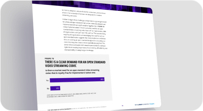 to limit its adoption, reduce choice for consumers, and continue a lock-in for a standard that was not designed for modern streaming use cases. A silver lining to these challenges is that there is a growing demand for a free and open standard that can be universally adopted and FIGURE 10 implemented without any financial or legal barriers. shows that when asked if there is a market need for an open standard video streaming codec that is RF for implementers, 86% of organizations said “yes” and 14% said “no.” The overwhelming majority of organizations acknowledging the need for such an open standard codec suggests that many businesses and indus- tries are seeking an open standard designed for streaming use cases that may also create a more equitable playing field. This trend reflects a broader shift toward open standards and high- lights the increasing importance of accessibility, affordability, and interoperability in today’s digital landscape. FIGURE 10 THERE IS A CLEAR DEMAND FOR AN OPEN STANDARD VIDEO STREAMING CODEC Is there a market need for an open standard video streaming codec that is royalty-free for implementers? (select one) Y�� 86% No 14% 2023 STATE OF OPEN STANDARDS SURVEY, Q36 (TABLE A42), SAMPLE SIZE = 421, N/A RESPONSES EXCLUDED FROM THE ANALYSIS. THE 2023 STATE OF OPEN STANDARDS EMPIRICAL RESEARCH ON THE TRANSITION TO OPEN STANDARDS 24
