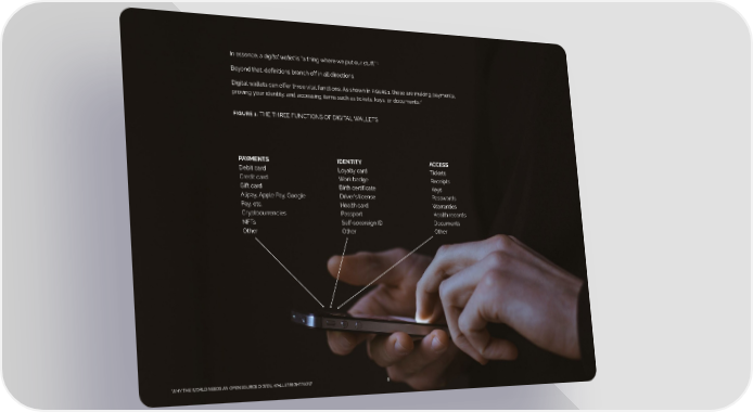 In essence, a digital wallet is “a thing where we put our stuff.” 1 Beyond that, definitions branch off in all directions. Digital wallets can offer three vital functions. As shown in FIGURE 1, these are making payments, proving your identity, and accessing items such as tickets, keys, or documents.2 FIGURE 1: THE THREE FUNCTIONS OF DIGITAL WALLETS PAYMENTS IDENTITY ACCESS Debit card Loyalty card Tickets Credit card Work badge Receipts Gift card Birth certificate Keys Alipay, Apple Pay, Google Driver’s license Passwords Pay, etc. Health card Warranties Cryptocurrencies Passport Health records NFTs Self-sovereign ID Documents Other Other Other WHY THE WORLD NEEDS AN OPEN SOURCE DIGITAL WALLET RIGHT NOW 6